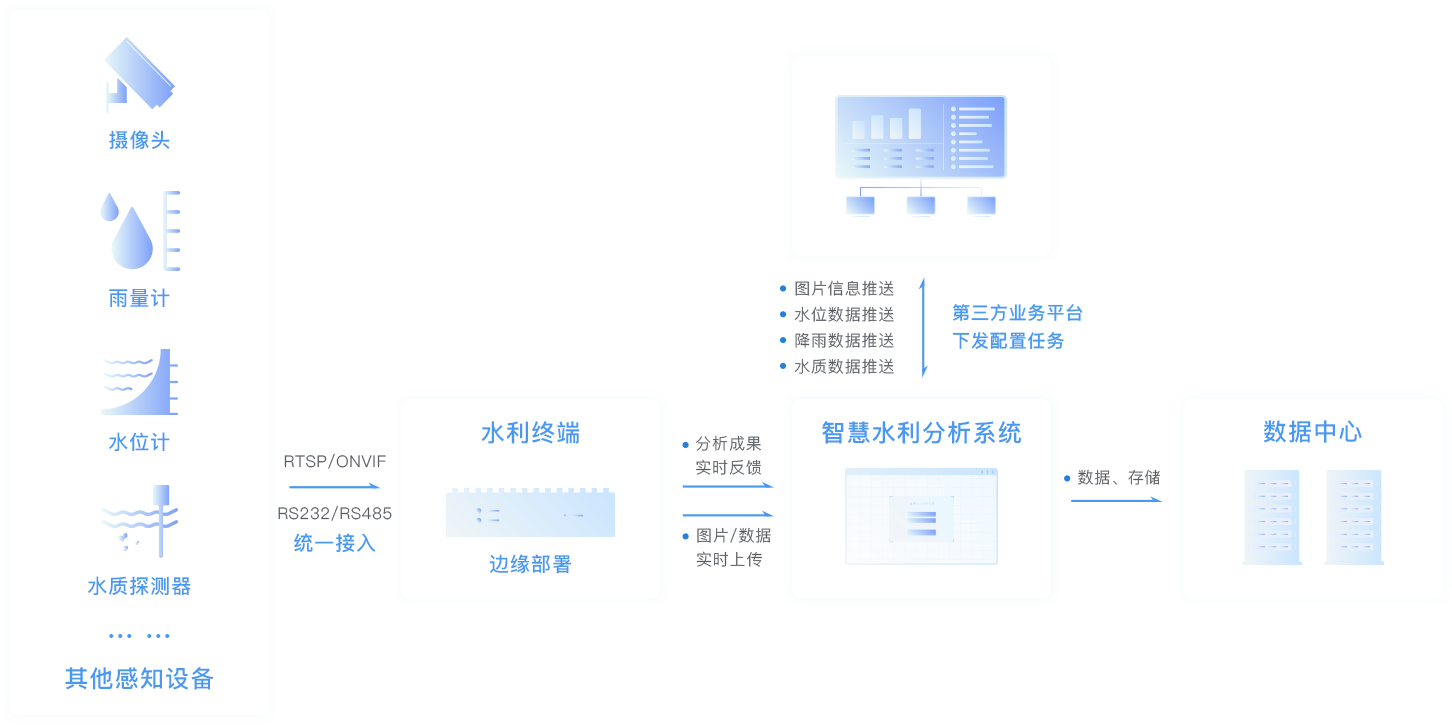瑞馳給合作伙伴提供智慧水利分析系統(tǒng), 主要是針對水利行業(yè)打造的一款智能分析系統(tǒng),實現(xiàn)河域排口自動檢測、排水量檢測(無排水、少量、中量、大量排水)、水尺識別、漂浮物檢測、游泳檢測、釣魚檢測、區(qū)域入侵等功能,產(chǎn)品結(jié)合視頻分析技術及物聯(lián)感知設備(雨量計、水位計、水質(zhì)探測器等),為水利行業(yè)的江湖河道、水庫、水電站等場景的水情監(jiān)管,提供專業(yè)解決方案。