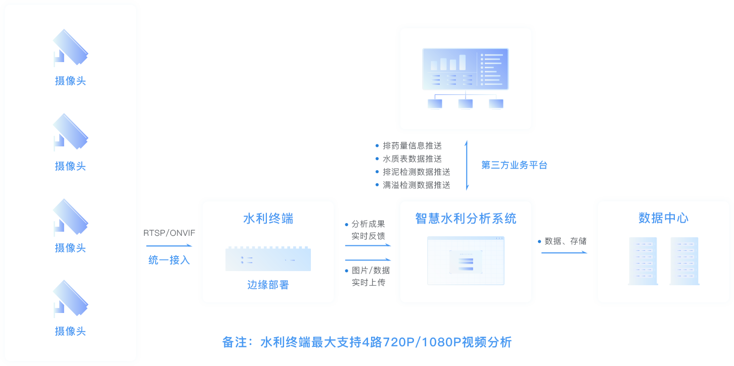 瑞馳水務(wù)智能巡檢系統(tǒng)將前端攝像頭(利舊/新建)統(tǒng)一接入到智慧水務(wù)終端上面,基于智能視頻分析的技術(shù)手段對水位監(jiān)管中的排藥量、水質(zhì)表、排泥(跑泥/斷泥)、污泥滿溢等水務(wù)應(yīng)用場景進(jìn)行智能化分析檢測,并采用標(biāo)準(zhǔn)API接口對接形式,將視頻監(jiān)控分析的結(jié)果推送至相應(yīng)的業(yè)務(wù)應(yīng)用平臺或服務(wù)器。