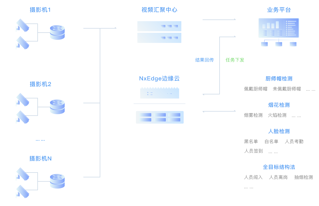 瑞馳給合作伙伴提供AI邊緣終端和邊緣計算服務器,基于Ai視覺算法,通過攝像頭自動識別后廚員工的行為,如:在離崗、抽煙打電話、是否佩戴廚師帽、是否戴口罩、區(qū)域入侵等異常行為進行自動識別,有效提高后廚監(jiān)管效率,保障食品安全。